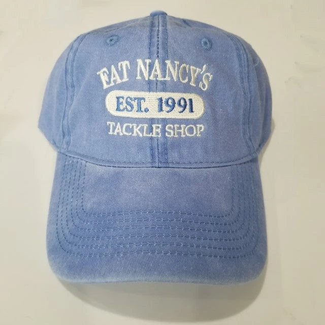Fishing baseball hat with Fat Nancy’s Est. 1991 Tackle Shop on the front Adjustable strap for sizing.