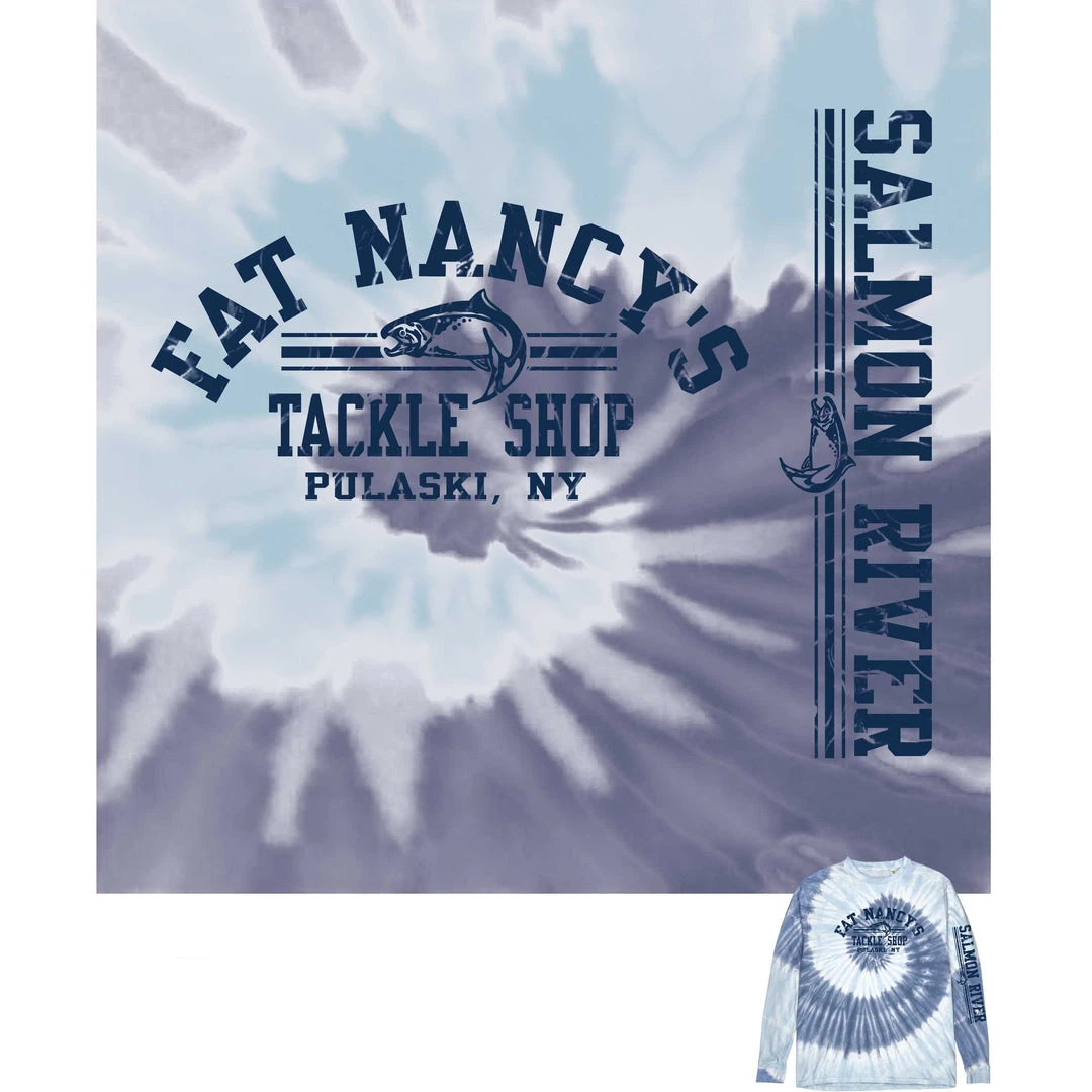 Tie-Dyed long sleeved, cuffed cotton shirt. “Salmon River” written on the left arm with full design on the front. Unisex sizing.