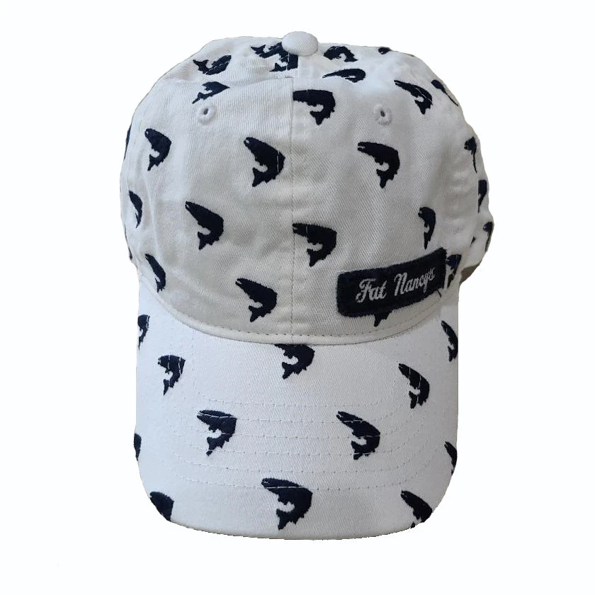 Fishing baseball hat with an Embroidered Salmon Print Design Available in White with an adjustable Velcro strap for sizing. 100% Cotton, Six Panel, Hand Constructed.