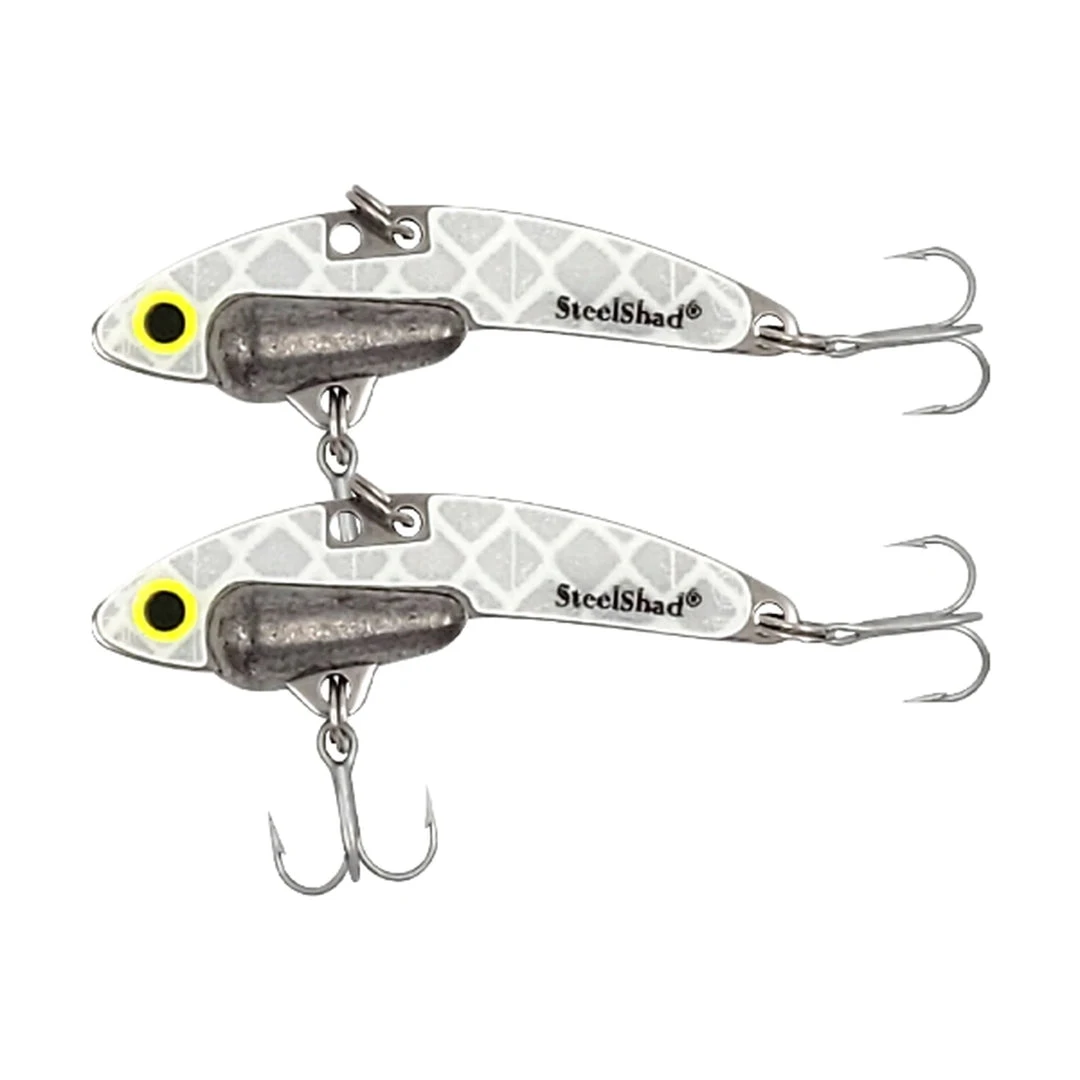The SteelShad® Mini 1/4 oz. blade bait is 1 3/4 inches long, made from durable stainless steel with a molded lead weight, and feature two #12 VMC Permasteel hooks that are coated for both fresh and salt water fishing. SteelShad’s glow effect is instantly charged by sunlight or any other light source. During the day, each lift of your rod will allow the natural sunlight to provide a long lasting luminescent charge to keep the lures glowing below the waters surface. During low light or nighttime conditions, the quick use of a flashlight can be used to recharge the lures between casts.