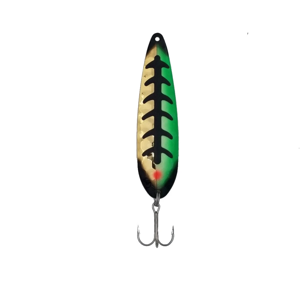 The Moonshine Half Moon Spoon is a hand painted, UV reflective spoon designed to attract salmon, steelhead, trout, pike and many other species. The silver back delivers eye-catching flashes that fish can’t resist.Â