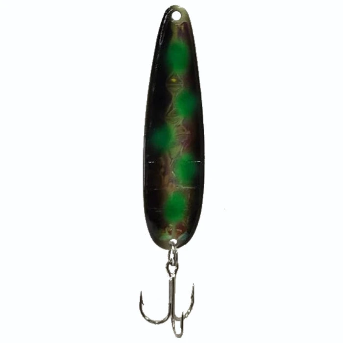 The Moonshine RV Spoon is a hand painted, UV reflective spoon designed to attract salmon, steelhead, trout, pike and many other species. The silver back delivers eye-catching flashes that fish can’t resist.Â