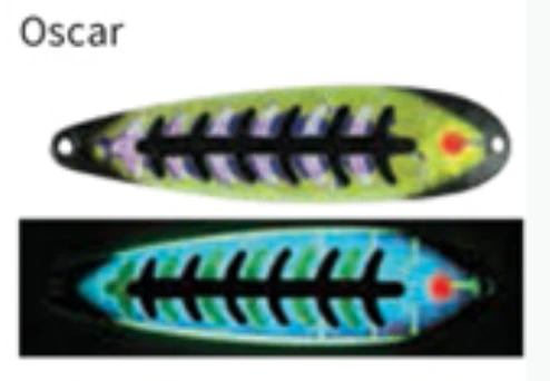 The Moonshine RV Series Spoon is a hand painted, UV reflective spoon designed to attract salmon, steelhead, trout, pike and many other species while trolling. The silver back delivers eye-catching flashes that fish can’t resist.Â
