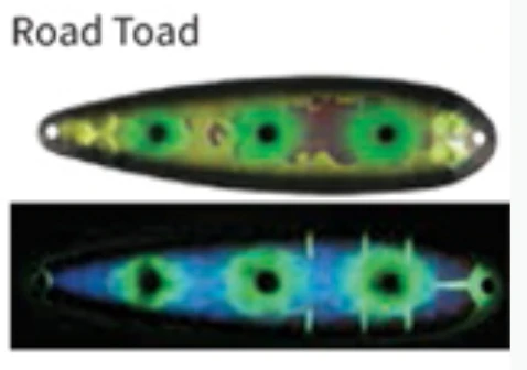 Please note: Images provided by Moonshine Lures to show the lure under regular light and under UV (sun) light. “Glow” colors will glow in the dark. UV lures “glow” under UV light, but may not glow in the dark.