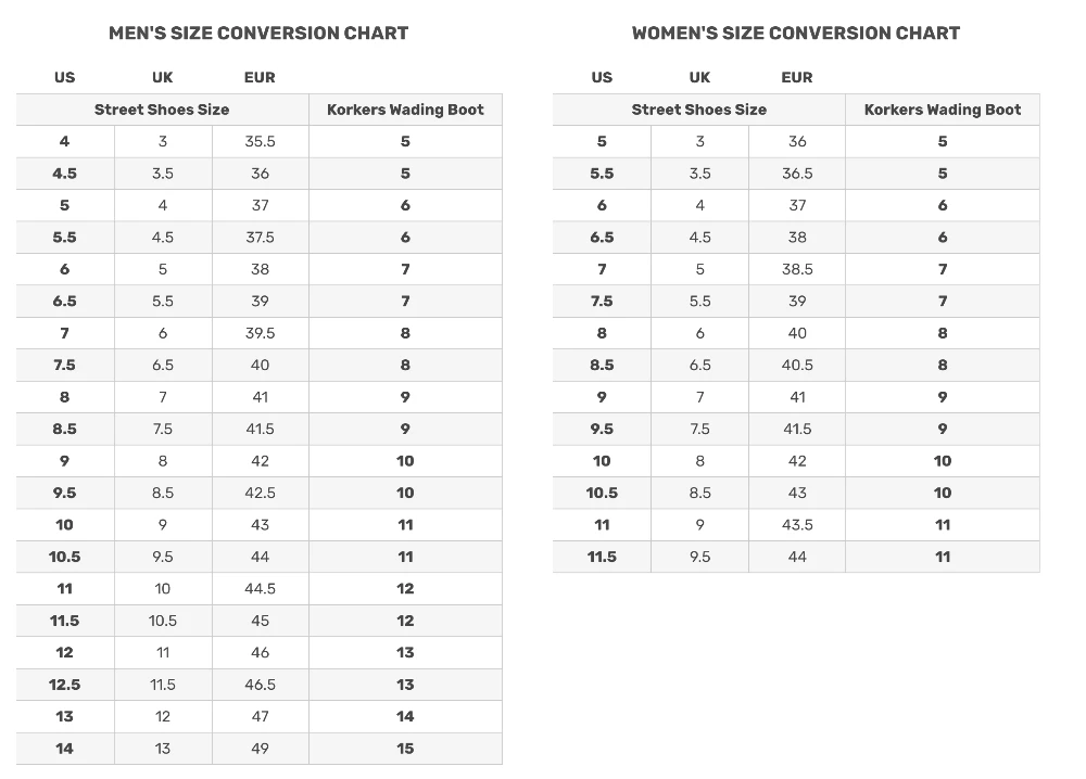 Due to variations in fit and thickness of different neoprene stocking foot socks, we recommend you use the sizing guide below to help guide your purchasing decision. Find your standard street shoe size on the left hand side of the chart and order the corresponding Korkers wading boot in the right hand column. Please try your product on to ensure the proper fit prior to use in the field.